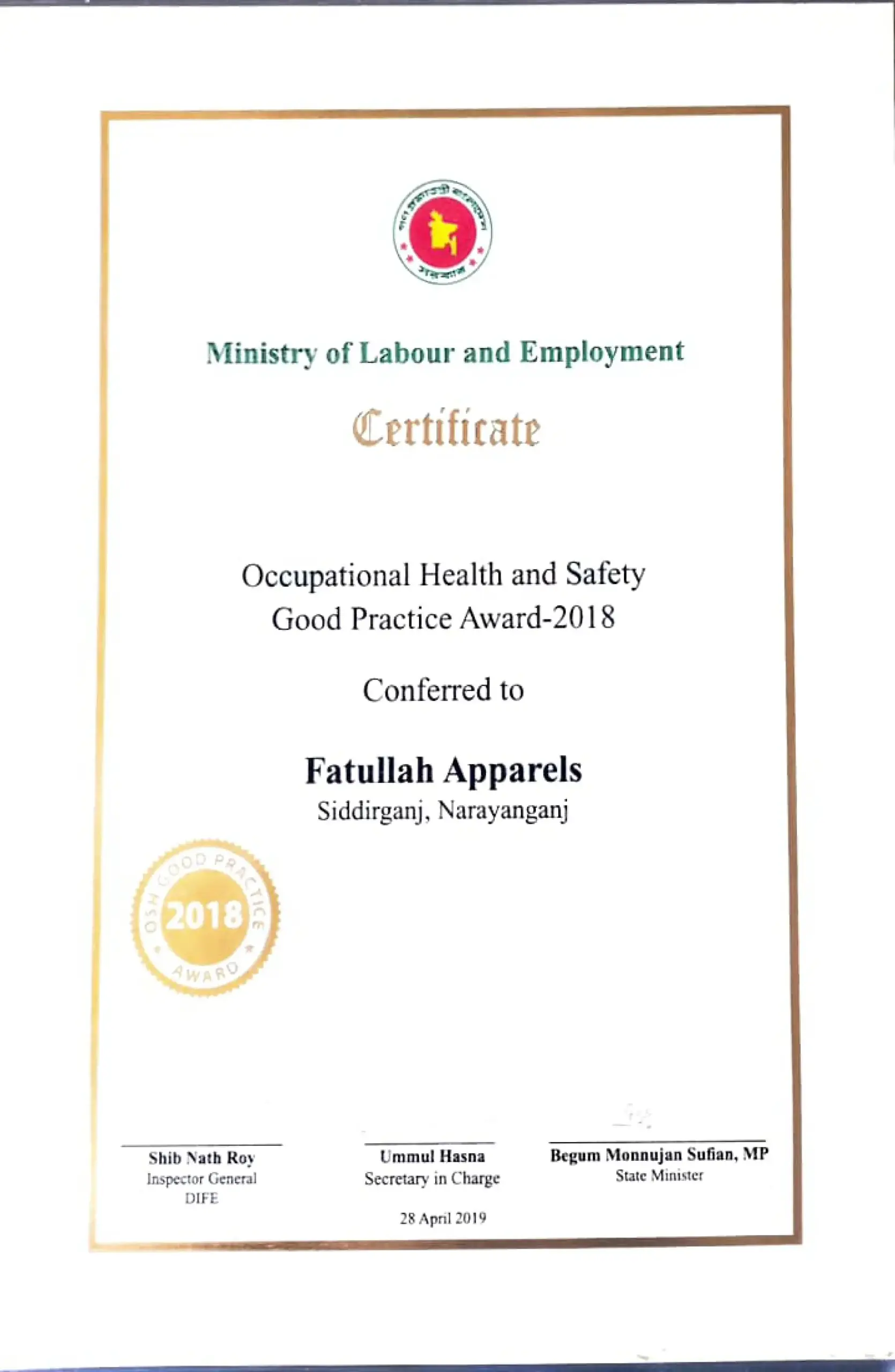 Recognized by the Ministry of Labor & Employment, Bangladesh for outstanding workplace safety measures and health practices.